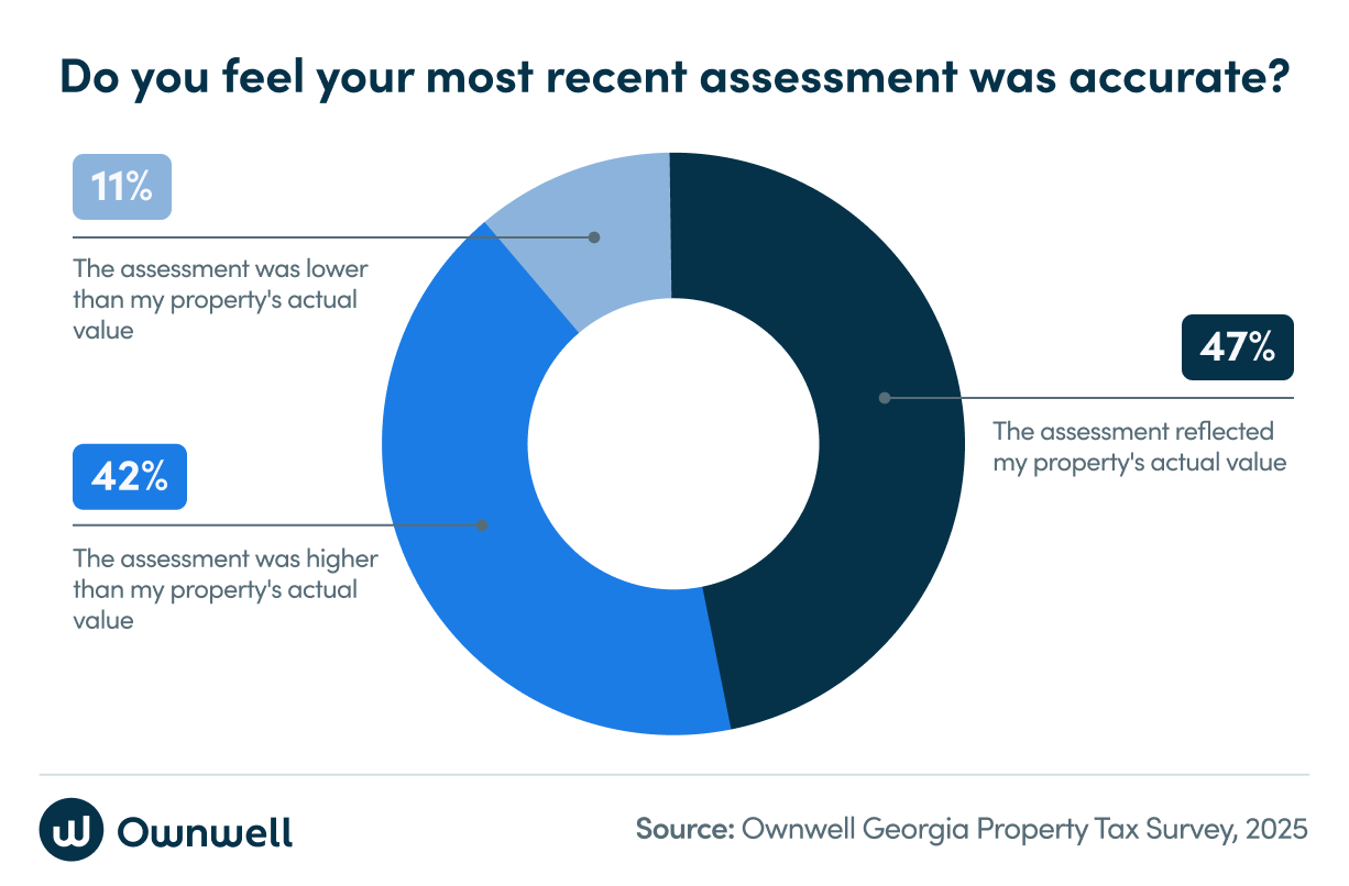 Our survey reveals a crisis of confidence in Georgia's property assessment system. More than half (52%) of homeowners were shocked by their last property tax assessment, signaling concern about rising property values and their impact on tax bills.